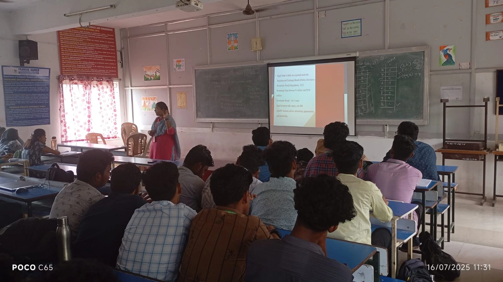 On 16.07.2025 a session was organized on the title “Angel Investment/VC Funding Opportunity for Early-Stage Entrepreneurs”by the Entrepreneurship Development Cell and Institution’s Innovation Council in association with the Computer Science and Engineering department. The session was handled by Mrs.M.Thanalakshmi, Assistant Professor Department of Business Administration, FXEC. 51 CSE B students and 2 faculty participated in the program. This event was coordinated by Mrs.M.Sathya, Assistant Professor, Computer Science and Engineering Department, Francis Xavier Engineering College