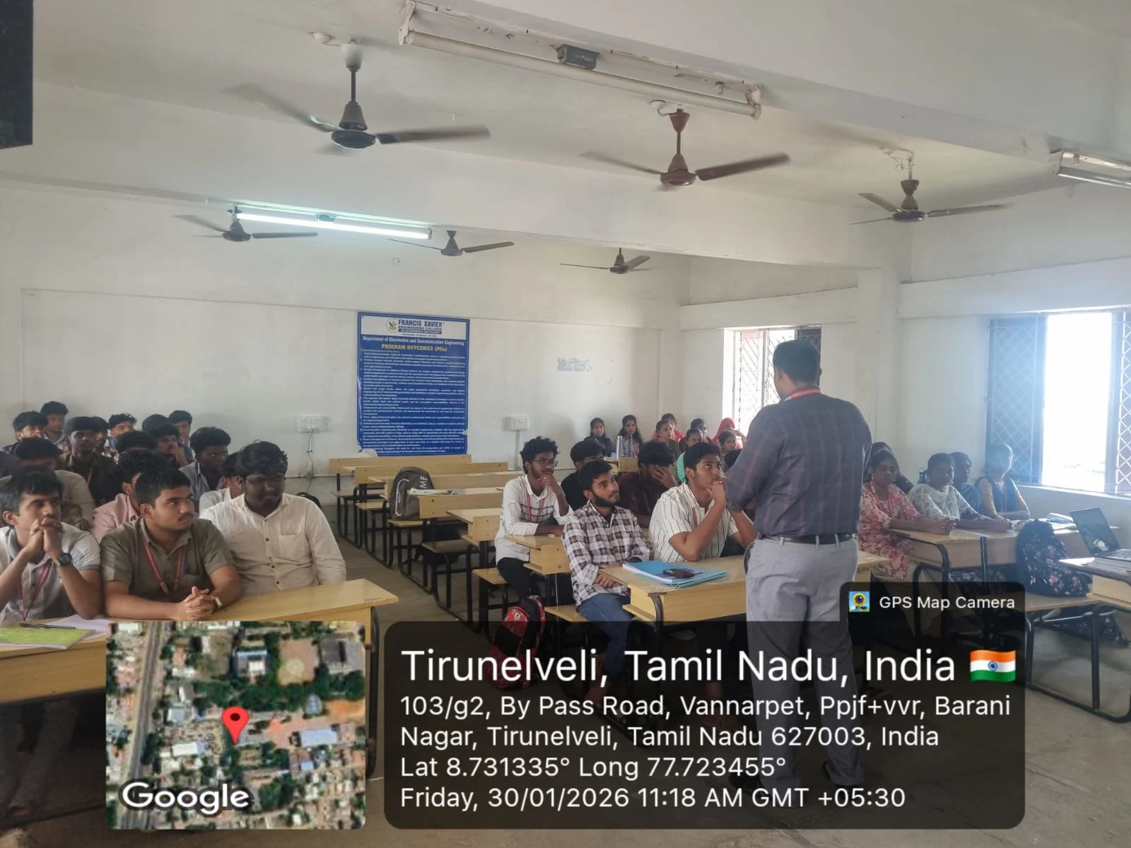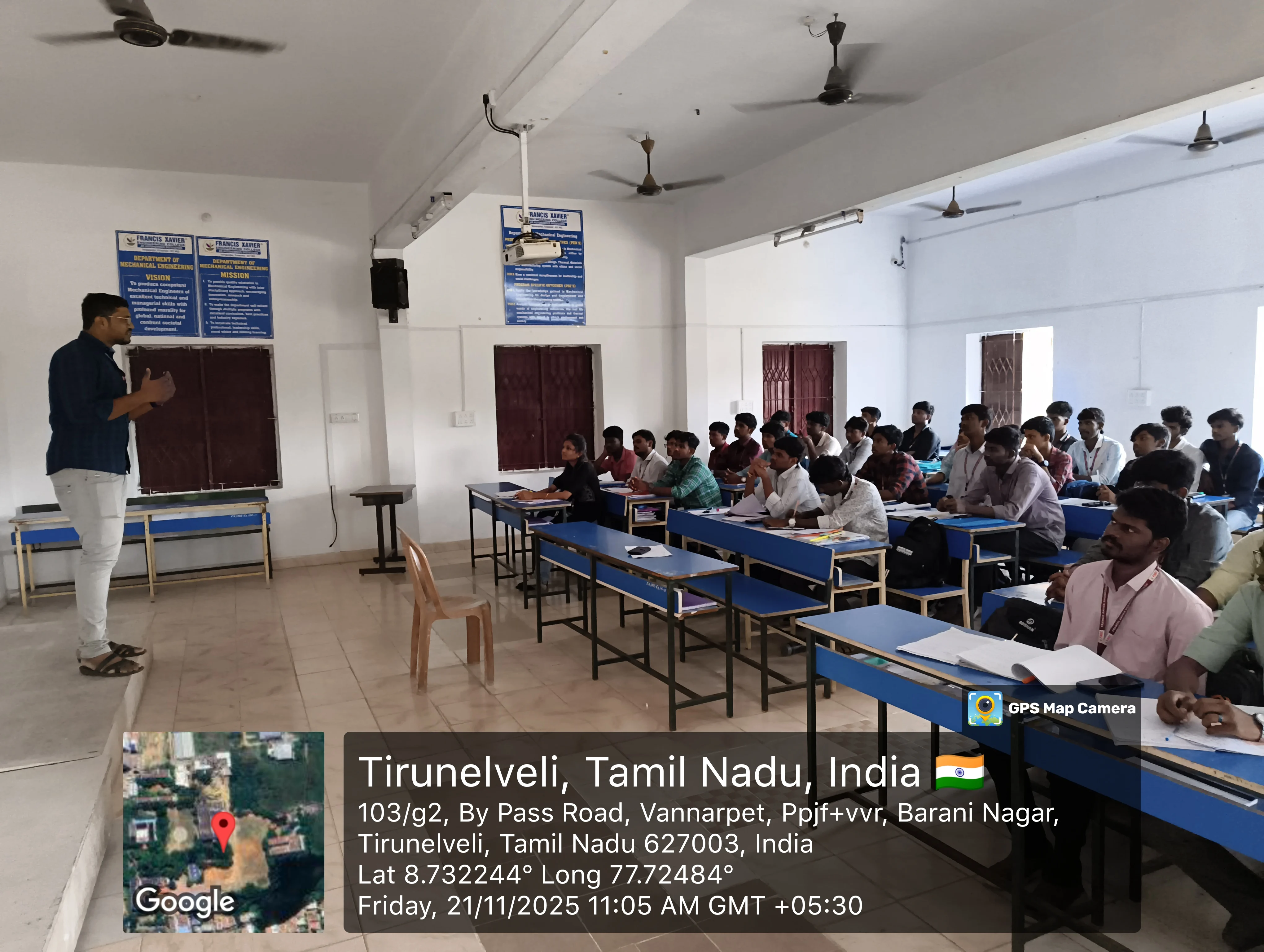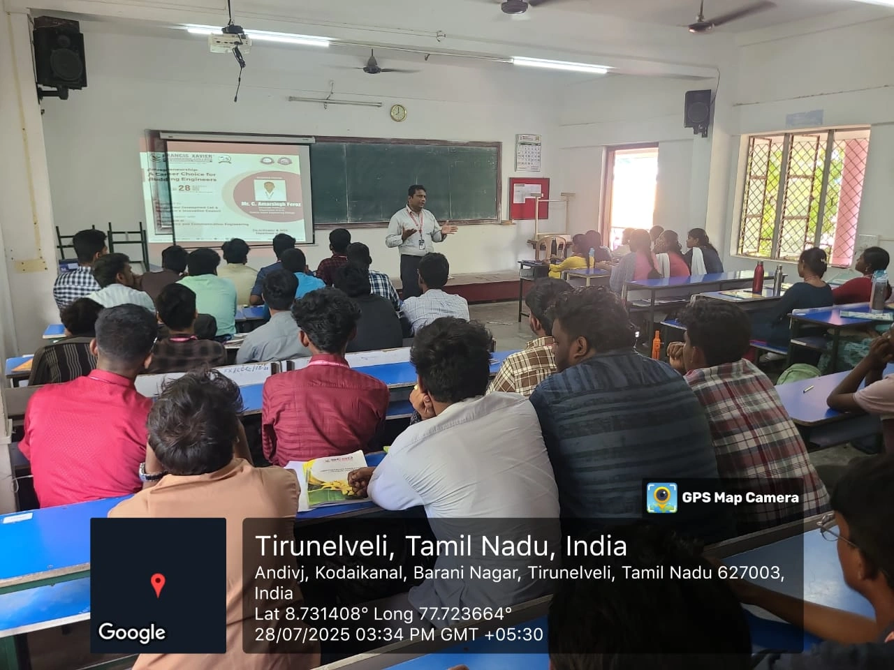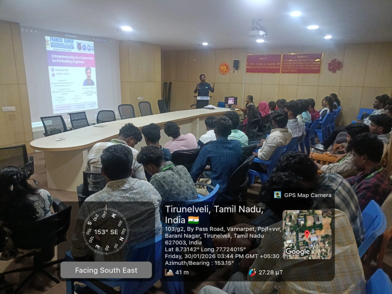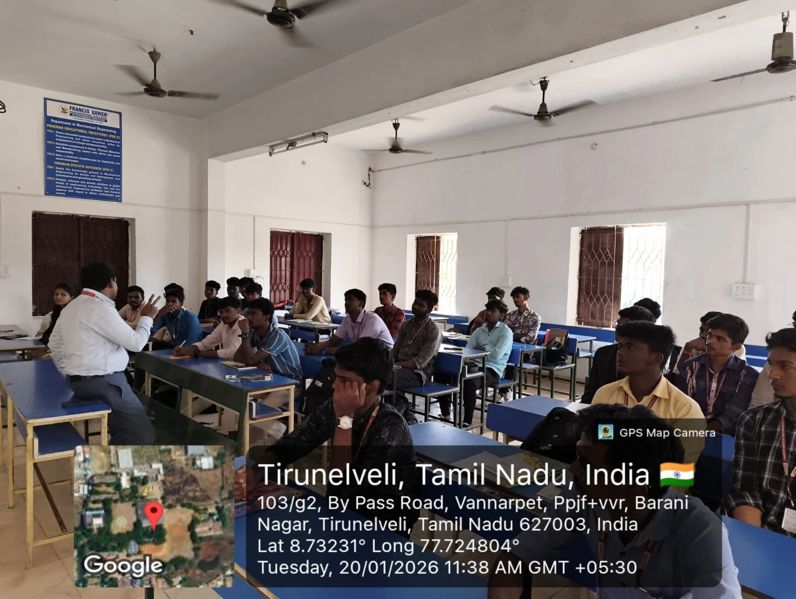 On 30.1.2026 a session was organized on the title “Entrepreneurship as a Career Path for the budding Engineers.” by the Entrepreneurship Development Cell and Institution’s Innovation Council in association with the Department of Electrical and Electronics. The session was handled by Mr. J. Selva Prakash , Director, J S Automotive Training Centre, Tirunelveli. 41 III EEE students and 2 faculties participated in the program. This event was coordinated by M. Mary Sumitha, Assistant Professor, Department of EEE, Francis Xavier Engineering College.