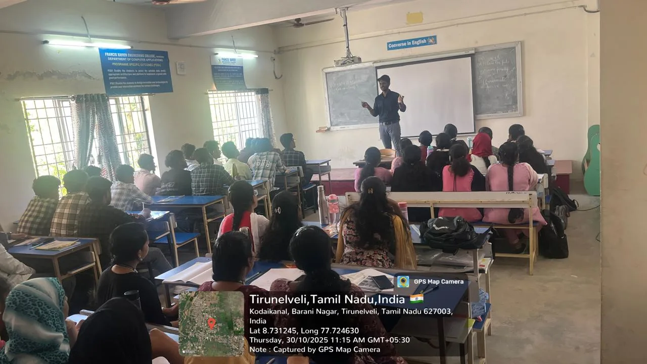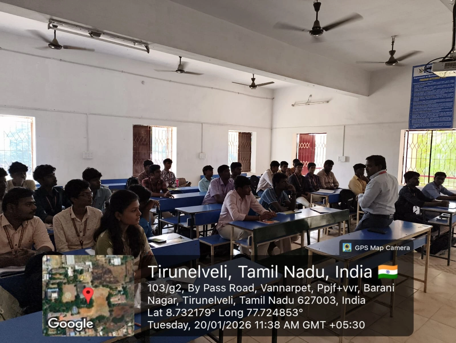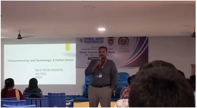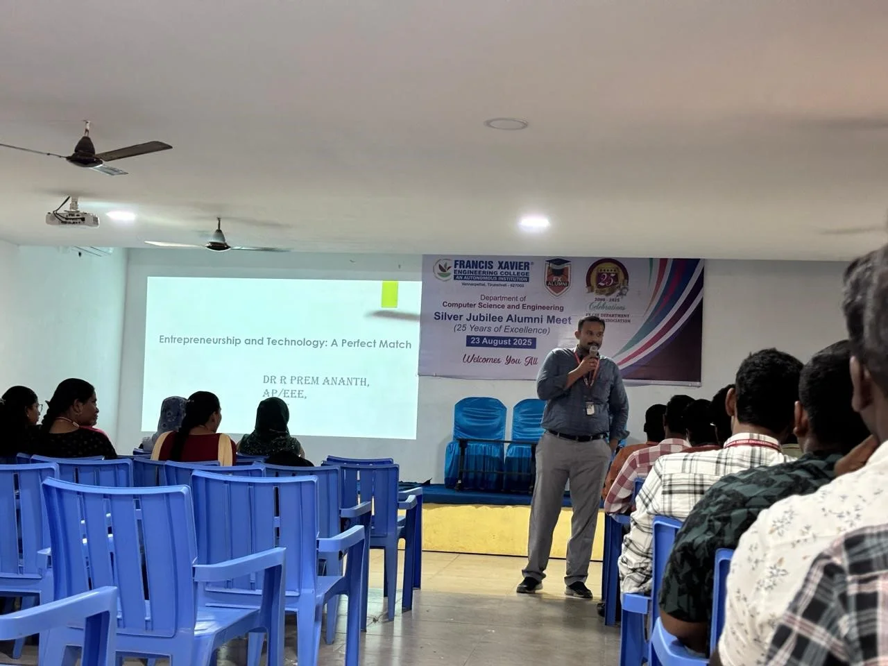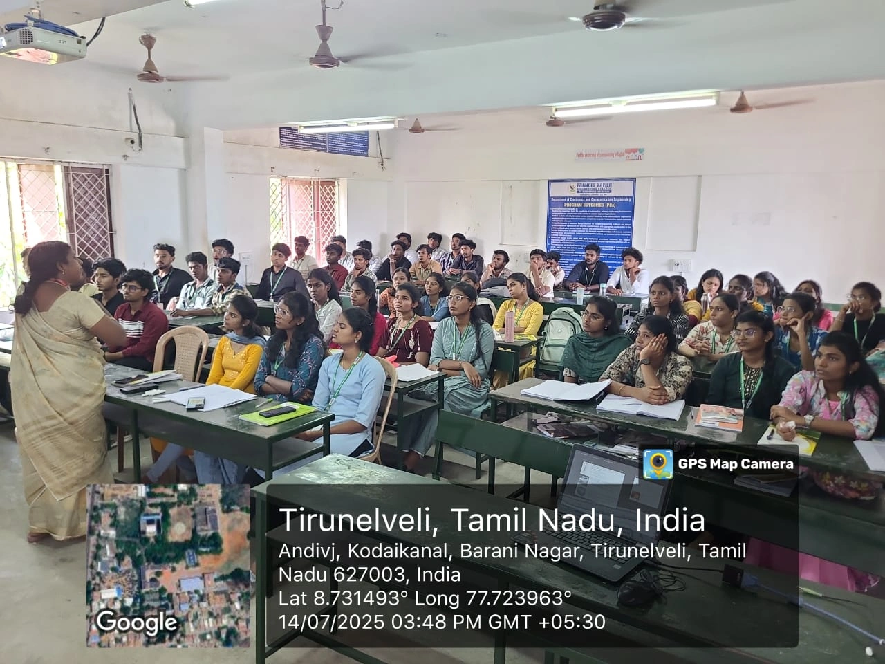 On 30.1.2026 a session was organized on the title “Entrepreneurship as a Career Path for the budding Engineers.” by the Entrepreneurship Development Cell and Institution’s Innovation Council in association with the Department of Electrical and Electronics. The session was handled by Mr. J. Selva Prakash , Director, J S Automotive Training Centre, Tirunelveli. 41 III EEE students and 2 faculties participated in the program. This event was coordinated by M. Mary Sumitha, Assistant Professor, Department of EEE, Francis Xavier Engineering College.