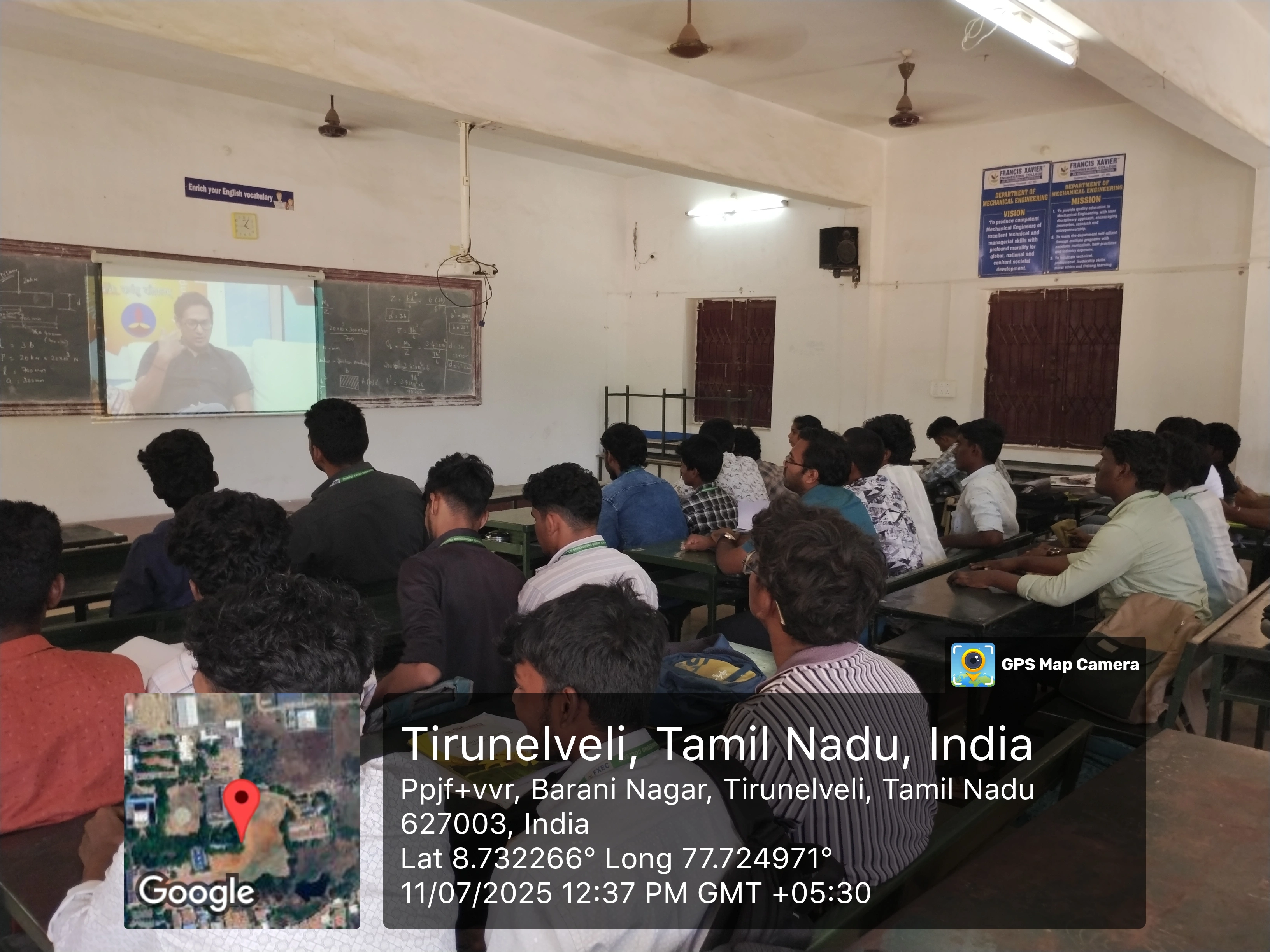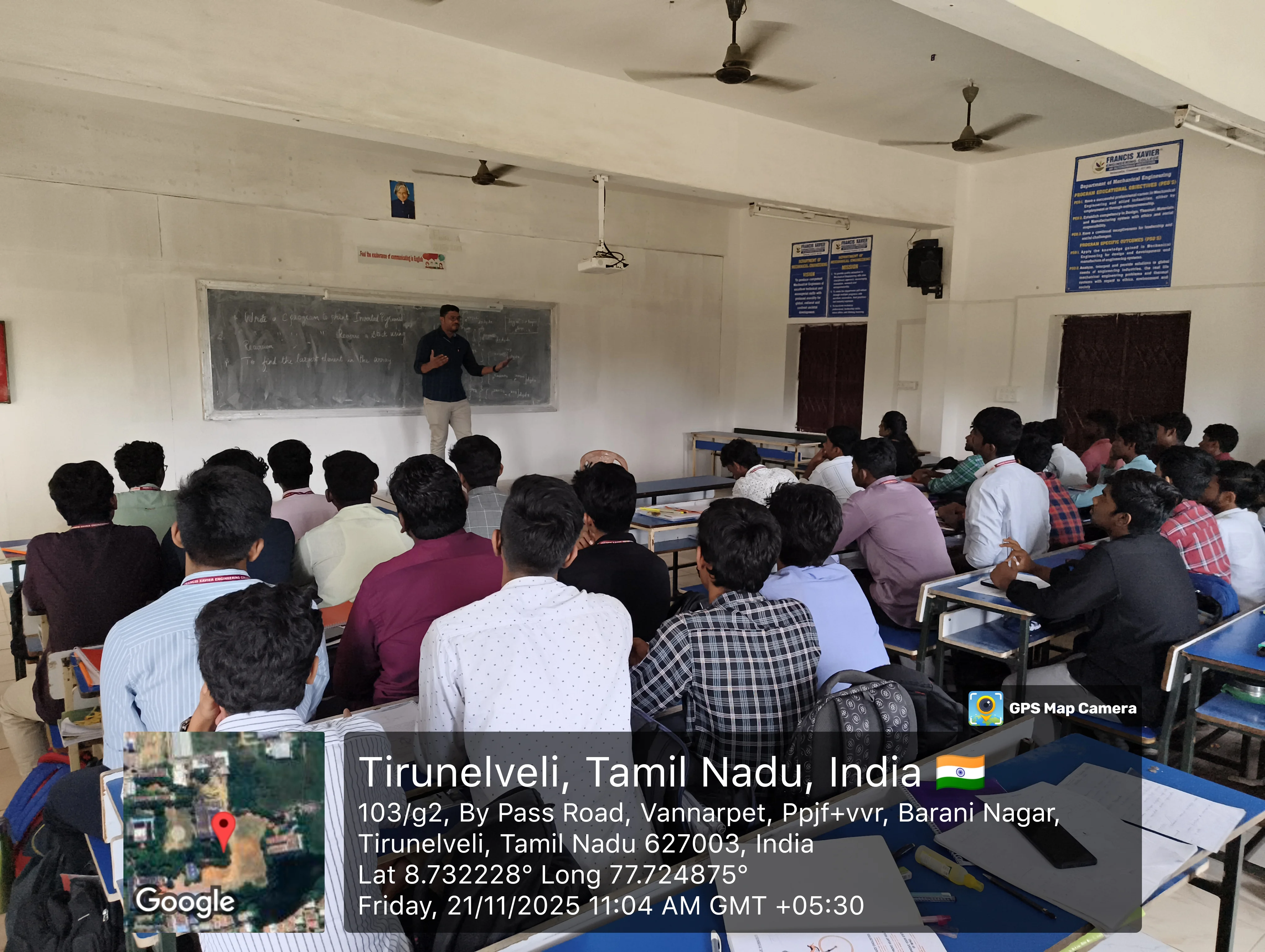 On 21.11.2025 a session was organized on the title Success Stories in Global Trade: A Dynamic Entrepreneur’s Journey Managing Multiple Businesses” by the Entrepreneurship Development Cell and Institution Innovation Cell in association with Mechanical Engineering department. The session was handled by Mr. S. Manoj Kumar, Safety Officer, Sri Sumukha Enterprises, Hosur. 45 First year, Mechanical Engineering students and 2 faculties participated in the program. This event was coordinated by Dr.K.Vinukumar, Assistant Professor, Department of Mechanical Engineering, Francis Xavier Engineering College.