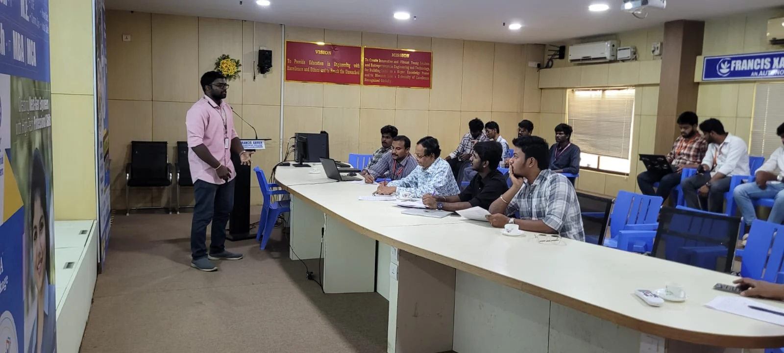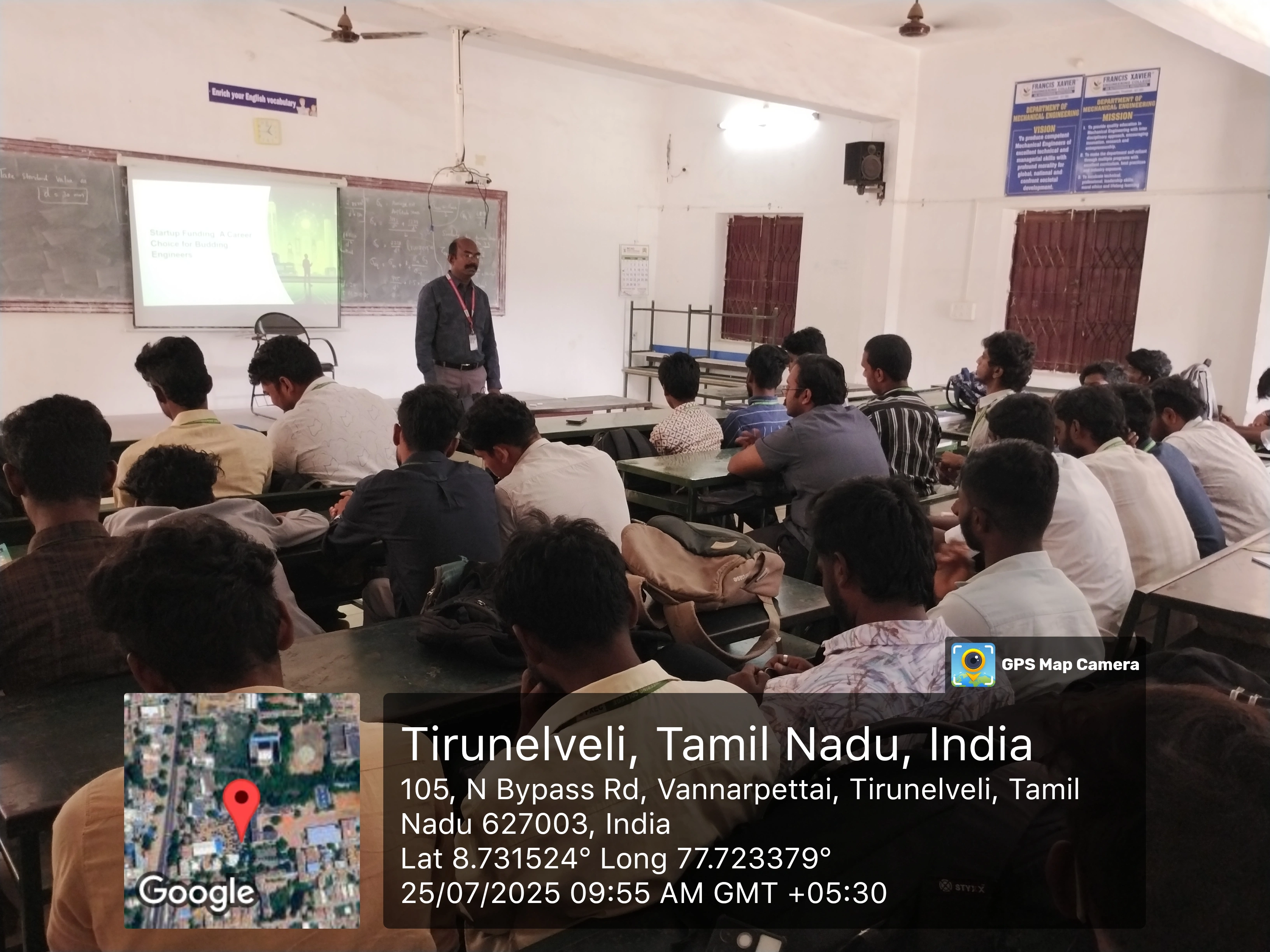 On 25.07.2025 a session was organized on the title “Startup Funding: A Career Choice for the Budding Engineers” by the Entrepreneurship Development Cell and Institution Innovation Cell in association with Mechanical Engineering department. The session was handled by Dr.K.RobinstonJeyasinghSwikker, Associate Professor, Francis Xavier Engineering College.52Third year Mechanical Engineeringstudents and 2 faculties participated in the program. This event was coordinated by Dr. K.Vinukumar, Assistant Professor, Department of Mechanical Engineering, Francis Xavier Engineering College.