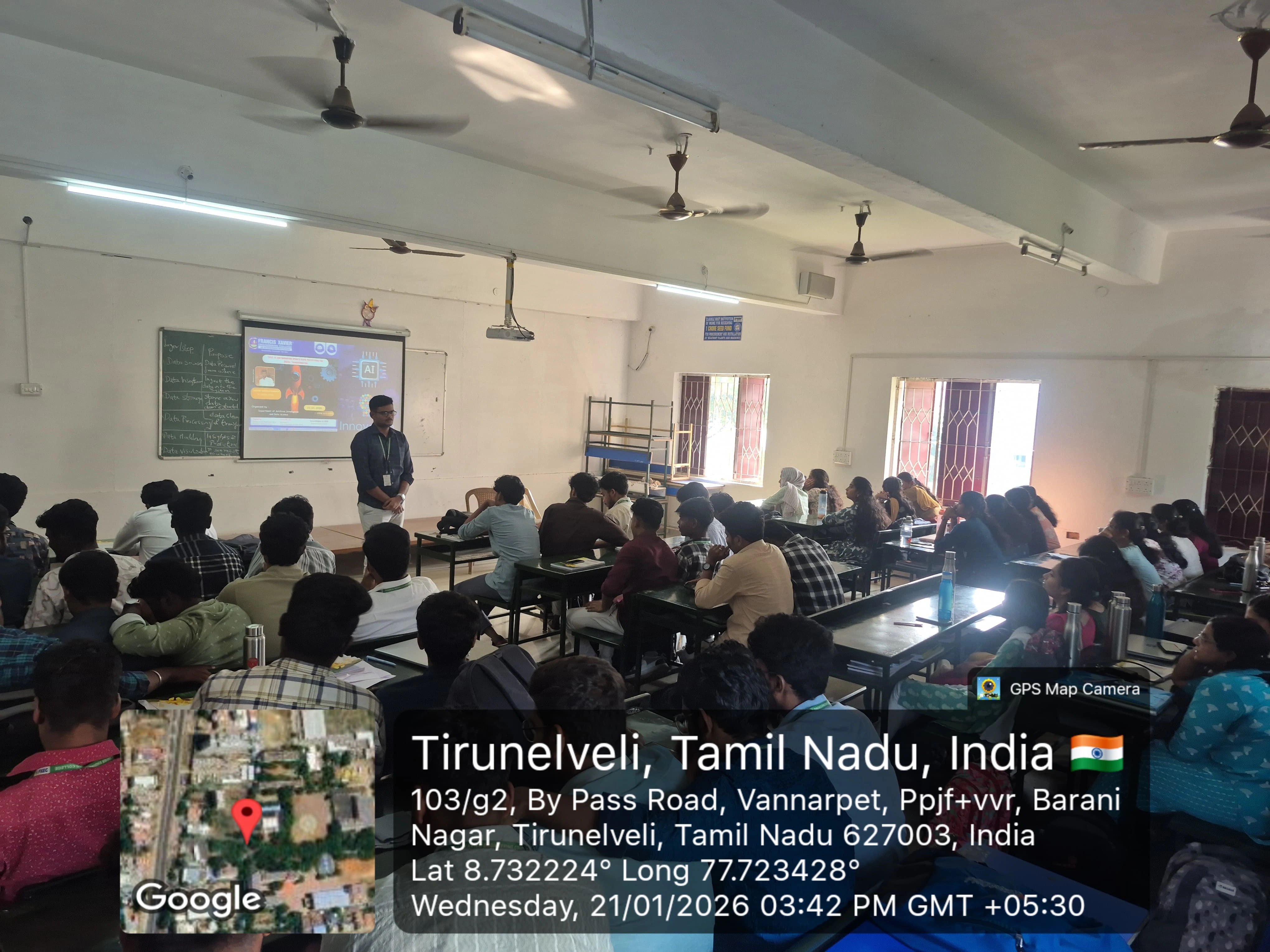 On 20.01.2026 a session was organized on the title “Turning Ideas into Products with AI Innovation Practices” by the Entrepreneurship Development Cell and Institution Innovation Cell in association with Mechanical Engineering department. The session was handled by Dr.S.M.Rajkumar, Associate Professor, Francis Xavier Engineering College. 43 First year, Mechanical Engineering students and 2 faculties participated in the program. This event was coordinated by Dr.K.Vinukumar, Assistant Professor, Department of Mechanical Engineering, Francis Xavier Engineering College.