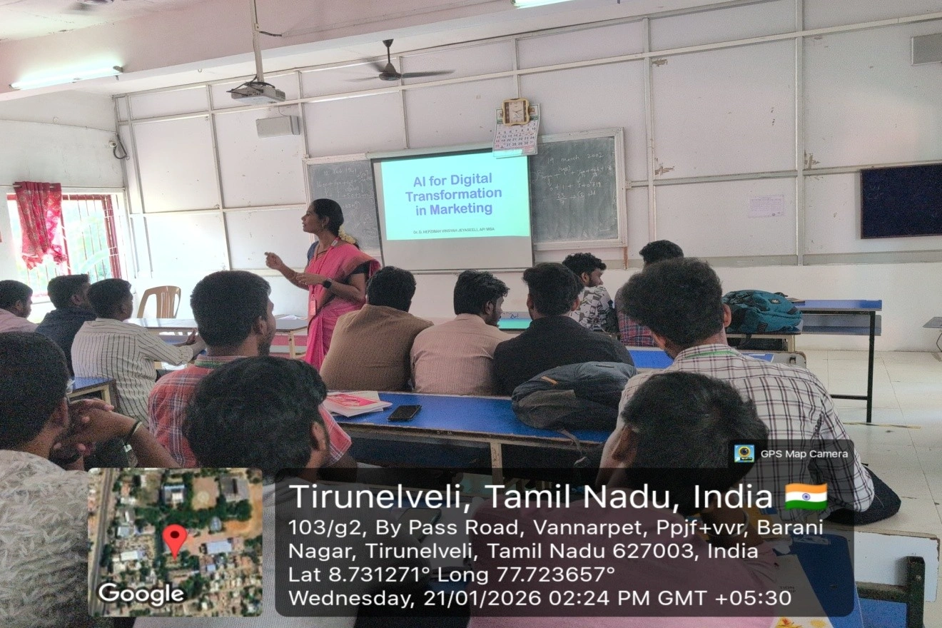 On 21.01.2026, a session titled “AI for Digital Transformation in Marketing” was organized by the Entrepreneurship Development Cell and Institution’s Innovation Council, in association with the Department of Computer Science and Engineering, Francis Xavier Engineering College. The session was handled by Dr. Hepzibah Vinsyah Jeyaseeli, Assistant Professor, Department of Management Studies, FXEC. A total of 51 students from III CSE B and 2 faculty members actively participated in the program. The event was coordinated by Mrs.M.Sathya, Assistant Professor, Computer Science and Engineering Department, Francis Xavier Engineering College.