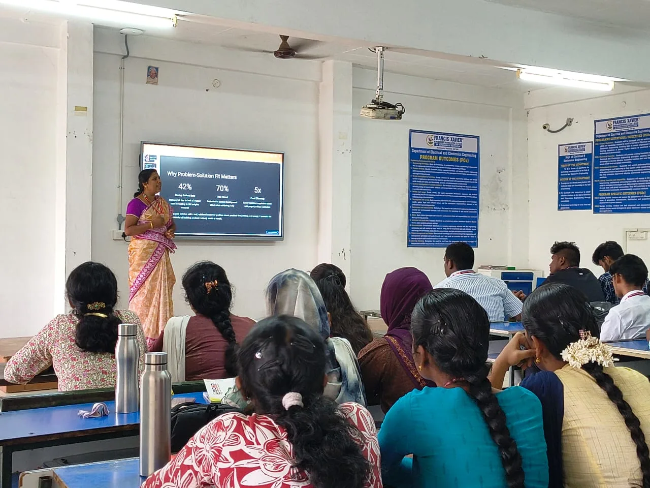 On 31.10.2025 a session was organized on the title “Session on Problem- Solution Fit” by the Entrepreneurship Development Cell and Institution’s Innovation Council in association with the Department of Electrical and Electronics. The session was handled by Mrs. M. Mary Sumitha, Assistant Professor / Department Electrical and Electronics Engineering, Francis Xavier Engineering College. 40 II EEE students and 2 faculties participated in the program. This event was coordinated by M. Mary Sumitha, Assistant Professor, Department of EEE, Francis Xavier Engineering College.