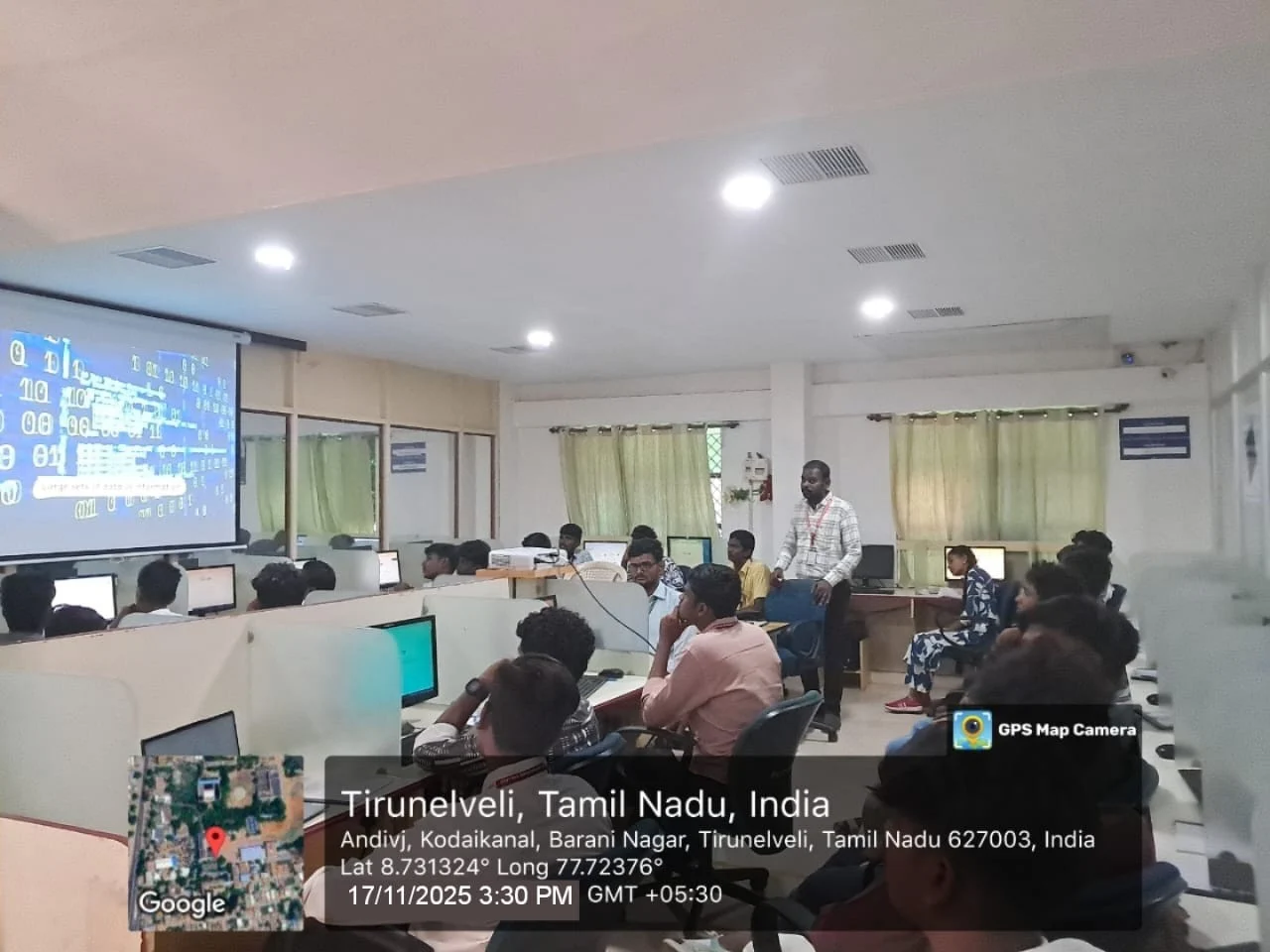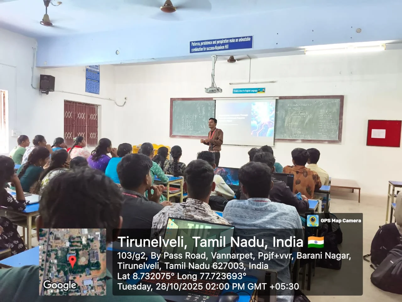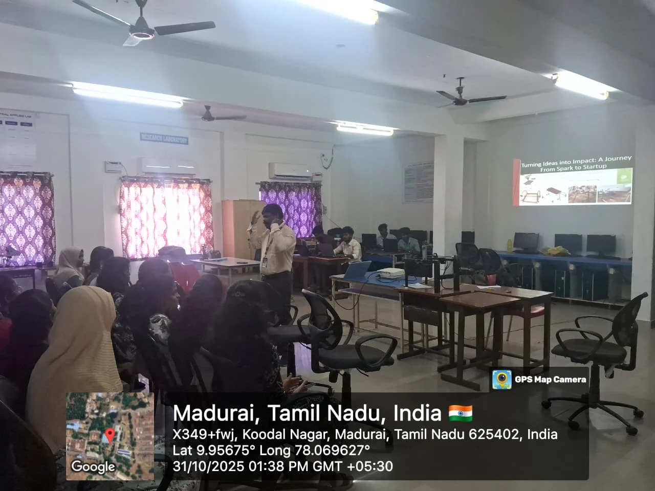 On 30.10.2025 a seminar was organized on the title “Workshop on AI and 4.0 tools for Innovators and Entrepreneurs” by the Entrepreneurship Development Cell and Institution’s Innovation Council in association with the Department of MCA. The session was handled by Er.Jey Siddharth, Founder & CEO of HELEYON Technologies, Founder & CEO of ROI Cosmetics Private Limited, CTO & Board member of Ezybee LLC. 60 students from MCA and 2 faculties participated in the program. Dr.M.Vijaya Maheswari, EDC Coordinator of MCA department coordinated the program.