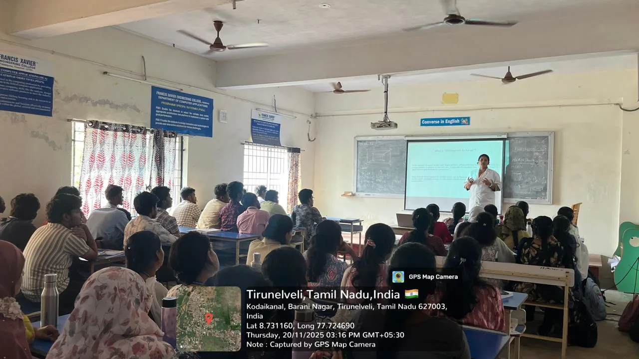 On 23.01.2026 a session was organized on the title “AI for Social Empowerment: Opportunities and Challenges” by the Entrepreneurship Development Cell and Institution’s Innovation Council in association with the Computer Science and Engineering department. The session was handled by Ms. Evangelin Sneha, Assistant Professor, Department of CSBS, FXEC. 48 I CSE D students and 1 faculty participated in the program. This event was coordinated by Ms. M. Keerthana, Assistant Professor, Department of English, Francis Xavier Engineering College.