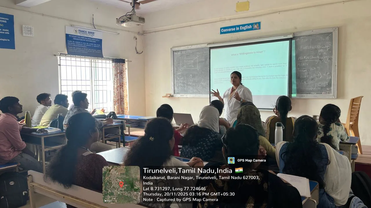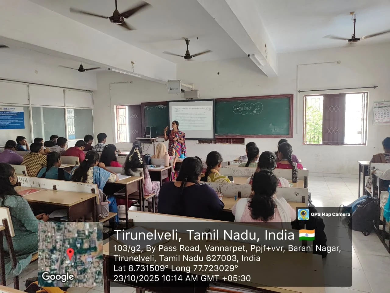 On 23.10.2025 a session was organized on the title “Driving Global Ventures: AI and Industry 4.0 Tools for Innovators and Entrepreneurs” by the Entrepreneurship Development Cell and IIC through offline mode in association with Department of Management Studies. The session was handled by Dr.D.Hepzibah Vinsyah Jeyaseeli. Assistant Professor, Department of Management Studies 46 students and 1 faculty participated in the program. This event was coordinated by Department of MBA, Francis Xavier Engineering College.