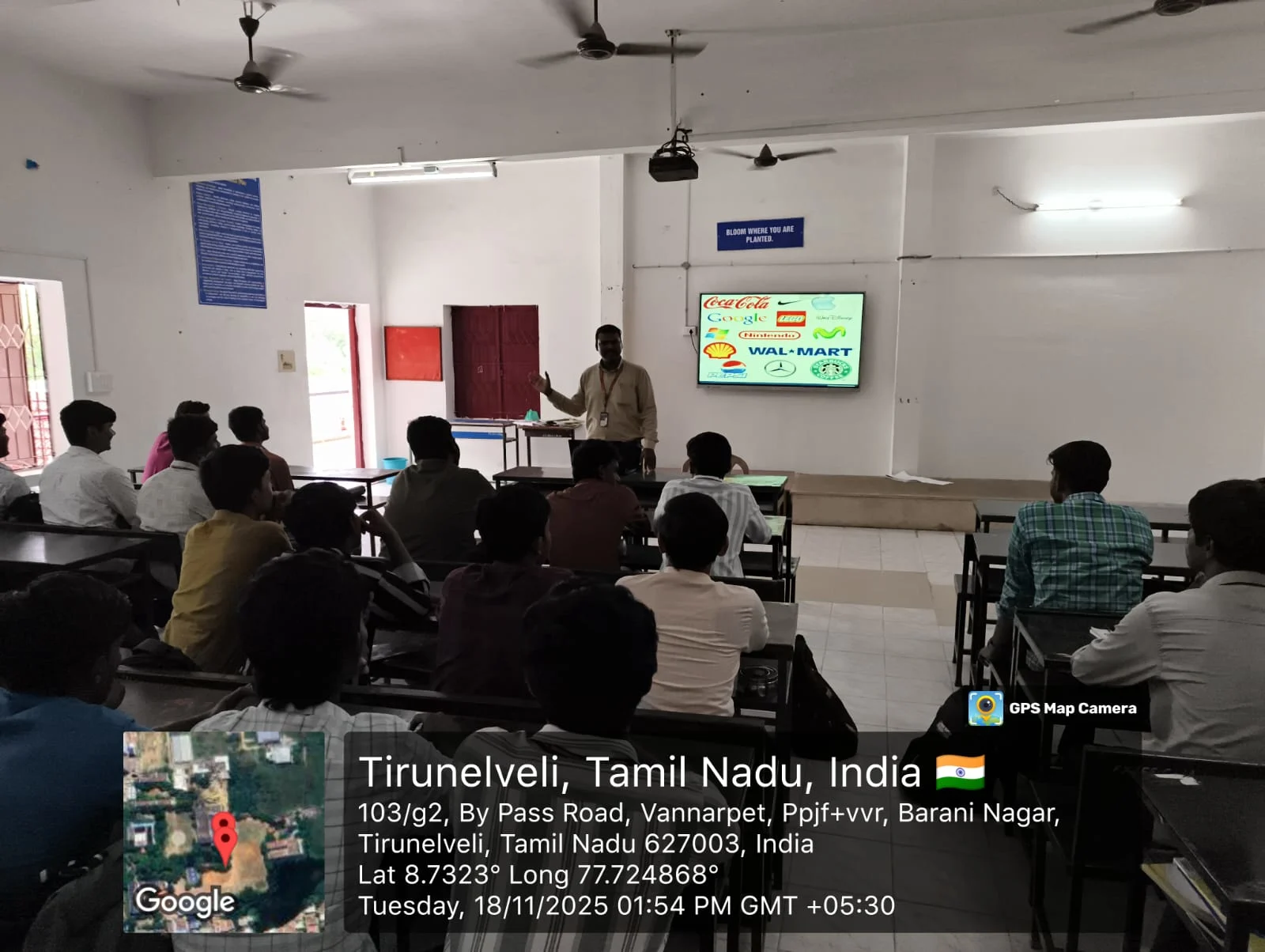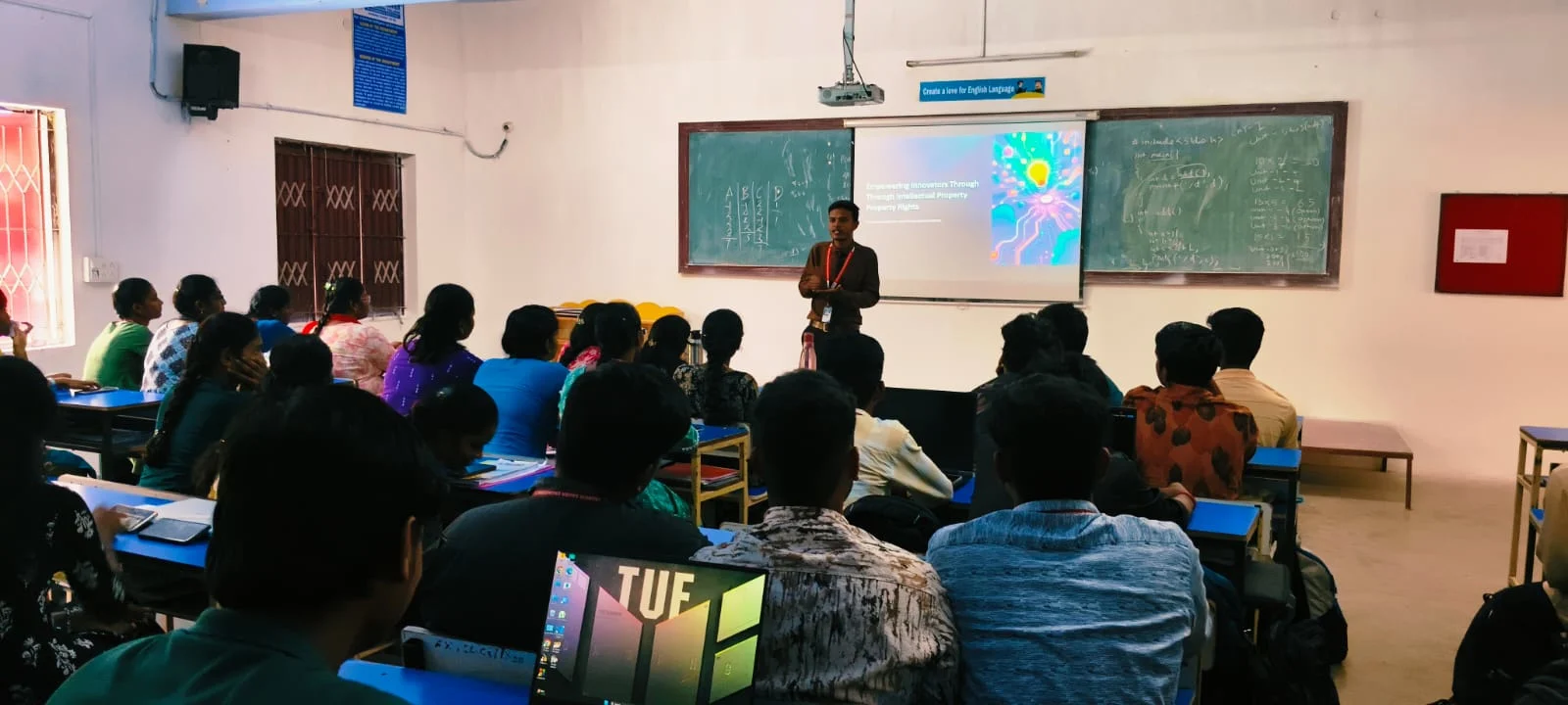 The speaker further illustrated the concept of trademarks with familiar brand examples, explaining how they help in building brand identity and consumer trust. He highlighted the Coca-Cola trade secret as a classic example of how companies safeguard confidential business information for competitive advantage. To explain copyrights, he referred to the case of Ilaiyaraaja’s musical works, emphasizing that creative compositions and artistic creations are protected under copyright law. The session provided students with valuable insights into how IPR not only encourages innovation but also enables inventors and entrepreneurs to benefit from their creativity. Overall, the program enhanced students’ understanding of intellectual property and motivated them to integrate IPR awareness into their future innovations and startup ideas.