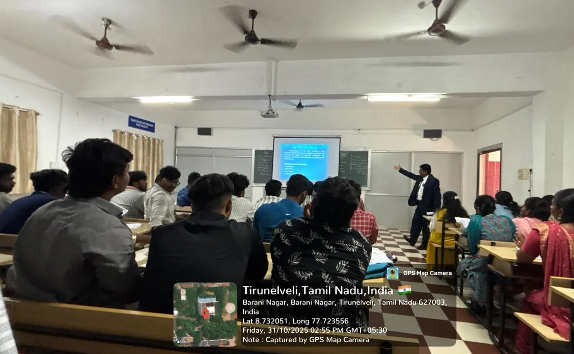 On 12.1.2026 a session was organized on the title “Ethics, Discipline & Long-Term Vision in Business and The Entrepreneur’s Mindset” by the Entrepreneurship Development Cell and IIC through offline mode in association with Department of Management Studies. The session was handled by Mr.Gandhi Kannan, MD - GK Enterprises & GM - Venkateswara Groups, 48 students and 1 faculty participated in the program. This event was coordinated by Department of MBA, Francis Xavier Engineering College.