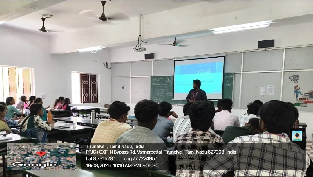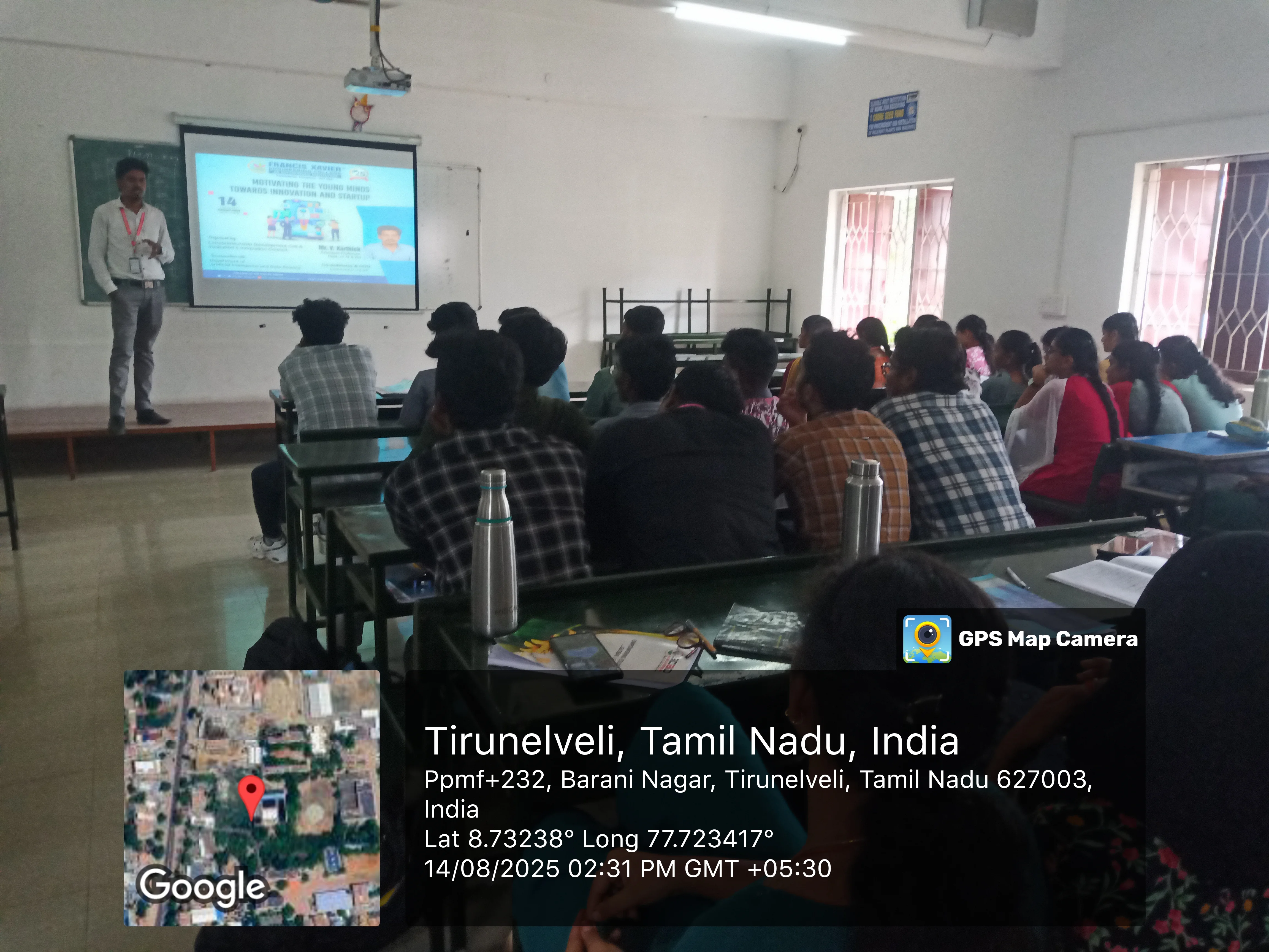 On 14.08.2025 a session was organized on the title Workshop on "Motivating the Young Minds Towards Innovation and Startup '' by the Entrepreneurship Development Cell in association with the Artificial Intelligence and Data Science department. The session was handled by Mr. V. Karthick AP/AI&DS , Francis Xavier Engineering College. Fifty II AI&DS-A students and one faculty participated in the program. This event was coordinated by Mrs. P. Sooriabrabha Assistant Professor, Department of Mathematics, Francis Xavier Engineering College.