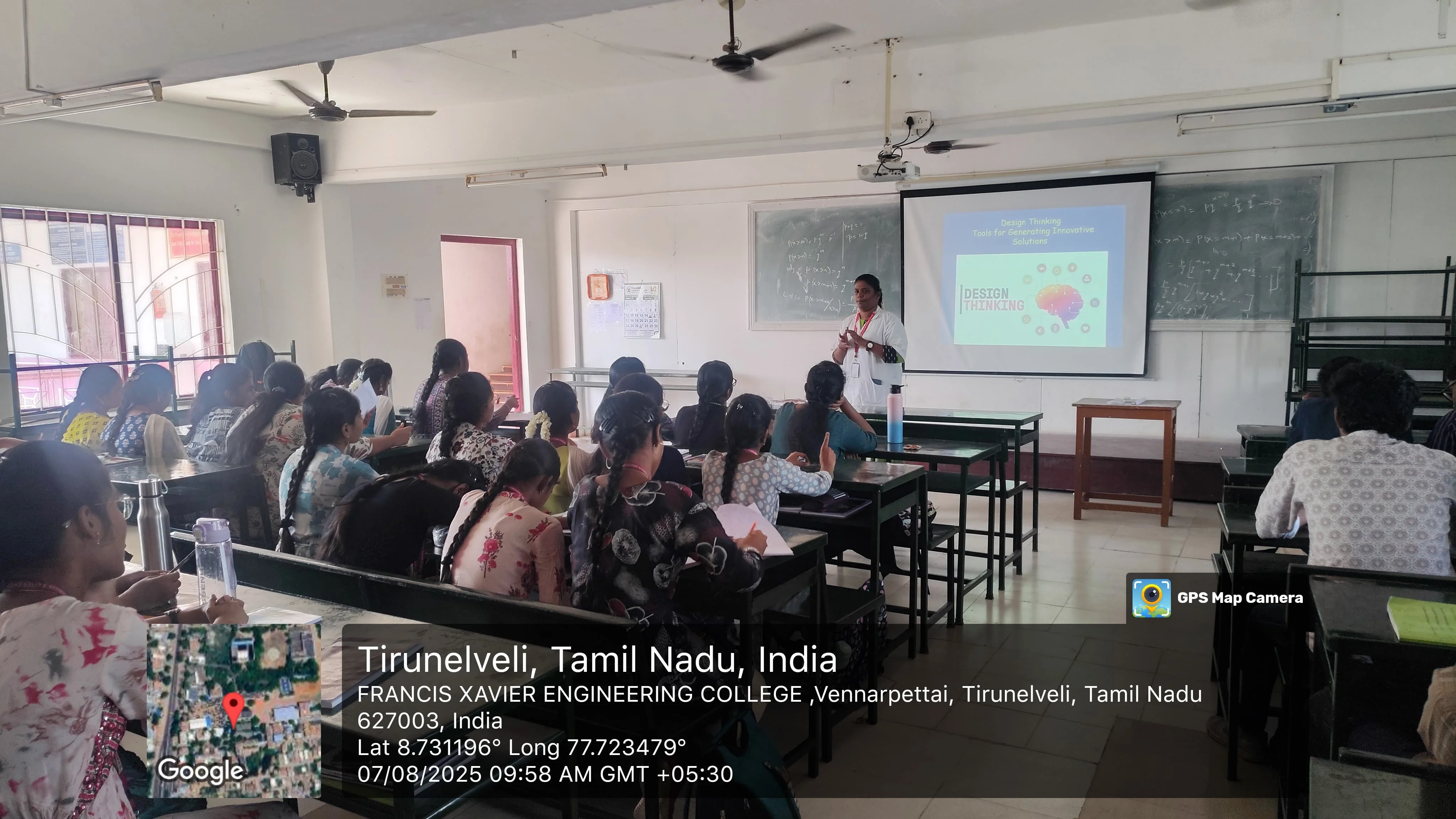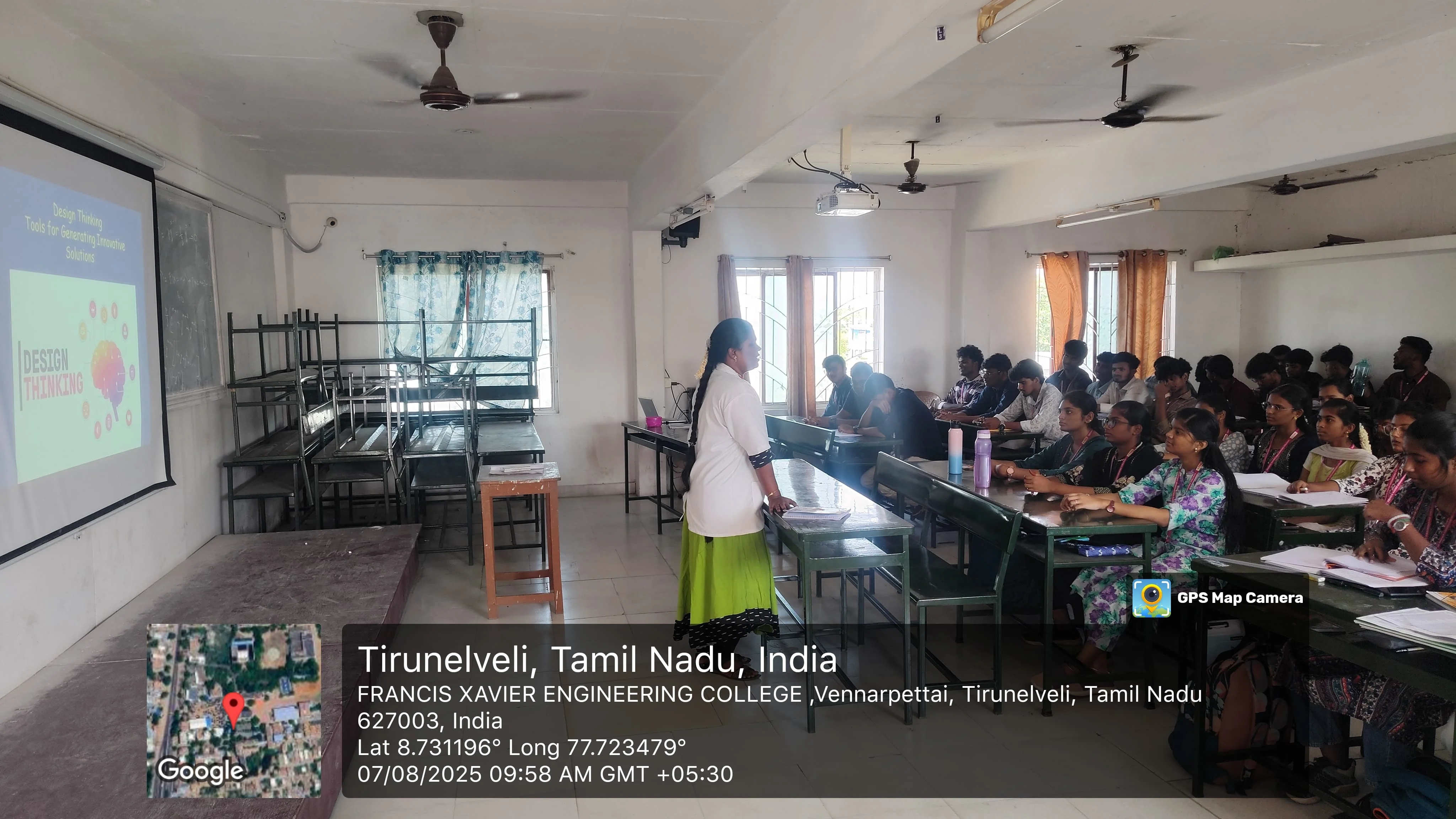 On 07.08.2025 a session was organized on the title “Design Thinking: A Tool for Generating Innovative Solutions” by the Entrepreneurship Development Cell and Institution’s Innovation Council in association with the Computer Science and Engineering department. The session was handled by Ms.A.Suba, Assistant Professor Department of Computer Science and Engineering, FXEC. 56 CSE B students and 2 faculty participated in the program. This event was coordinated by Mrs.M.Sathya, Assistant Professor, Computer Science and Engineering Department, Francis Xavier Engineering College