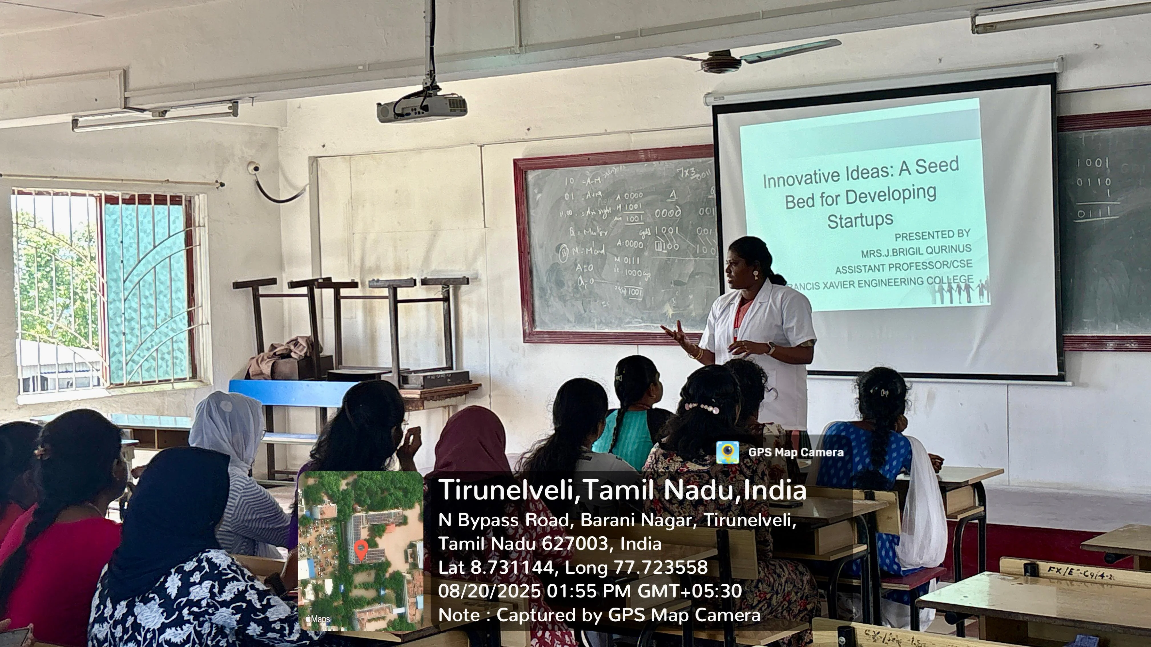 On 21.11.2025 a session was organized on the title “Innovation in Entrepreneurship: Bringing Ideas to Life” by the Entrepreneurship Development Cell and Institution’s Innovation Council in association with the Computer Science and Engineering department. The session was handled by Mrs. Brigil Qurinus, Assistant Professor, Department of CSE, FXEC. 43 I CSE D students and 1 faculty participated in the program. This event was coordinated by Ms. M. Keerthana, Assistant Professor, Department of English, Francis Xavier Engineering College.