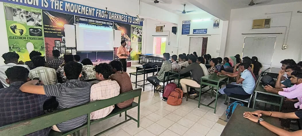 On 8.08.2025 a session was organized on the title “Startup Ideas: A Career Choice in the Present-day Context” by the Entrepreneurship Development Cell and Institution’s Innovation’s Council in association with Department of Electrical and Electronics Engineering. The session was handled by Mr. N.V Selvam, Assistant Professor, Department of Electrical and Electronics Engineering, Francis Xavier Engineering College. 40 III EEE students and 2 faculties participated in the program. This event was coordinated by M. Mary Sumitha, Assistant Professor, Department of EEE, Francis Xavier Engineering College.