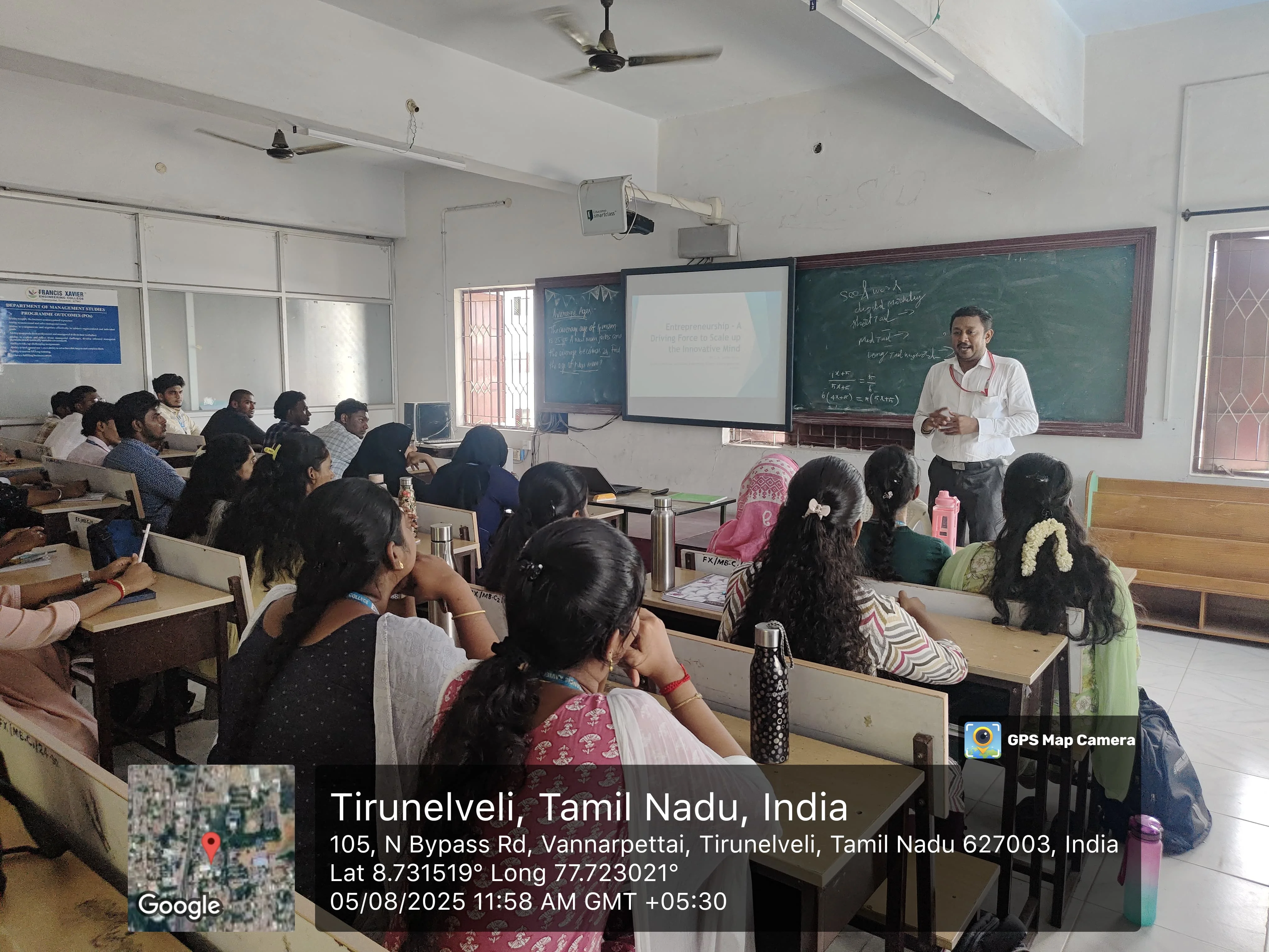 On 5.08.2025 a session was organized on the title “Entrepreneurship - A Driving Force to Scale up the Innovative Mind” by the Entrepreneurship Development Cell and IIC through offline mode in association with Department of Management Studies. The session was handled by Mr. S. M. Sunder Rajan. Assistant Professor. Mechanical Engineering, FXEC. 40 II year MBA students and 1 faculty participated in the program. This event was coordinated by Dr.V.M.Sangeetha, Assistant Professor, Department of MBA, Francis Xavier Engineering College.