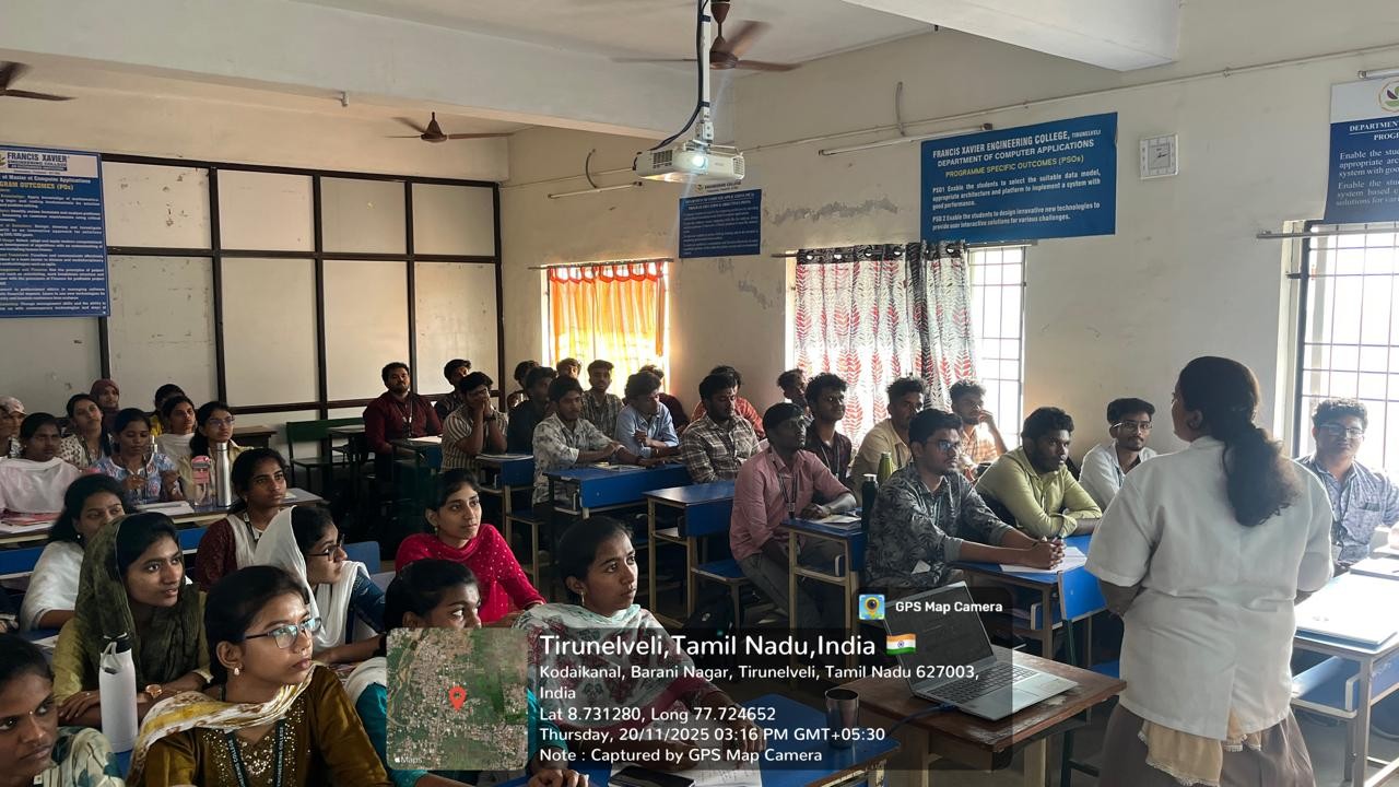 On 20.11.2025 a seminar was organized on the title “Problem-Solution Fit Assessment” by the Entrepreneurship Development Cell and Institution’s Innovation Council in association with the Department of MCA. The session was handled by Dr M.Vijaya Maheswari, Assistant Professor, Department of MCA, Francis Xavier Engineering College, Tirunelveli. 60 students from MCA and 2 faculties participated in the program. Dr.M.Vijaya Maheswari, EDC Coordinator of MCA department coordinated the program.